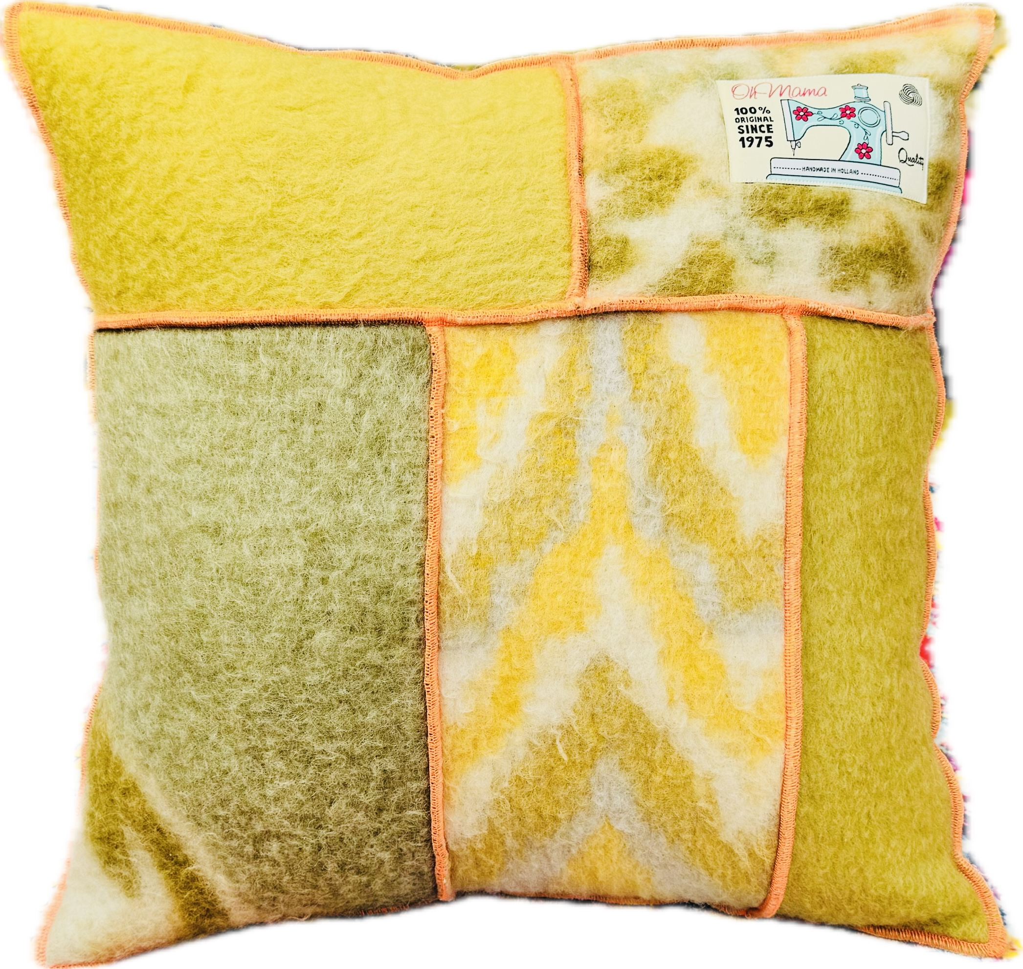 Dit handgemaakt wollen kussen 45×45 cm gerecyclede wol is met liefde gemaakt uit zorgvuldig geselecteerde vintage dekens en afgewerkt met neon oranje lockgaren. Je haalt daarmee een uniek, duurzaam designstuk in huis: de zachtheid van wol, het verhaal van hergebruik en een moderne, speelse touch.
