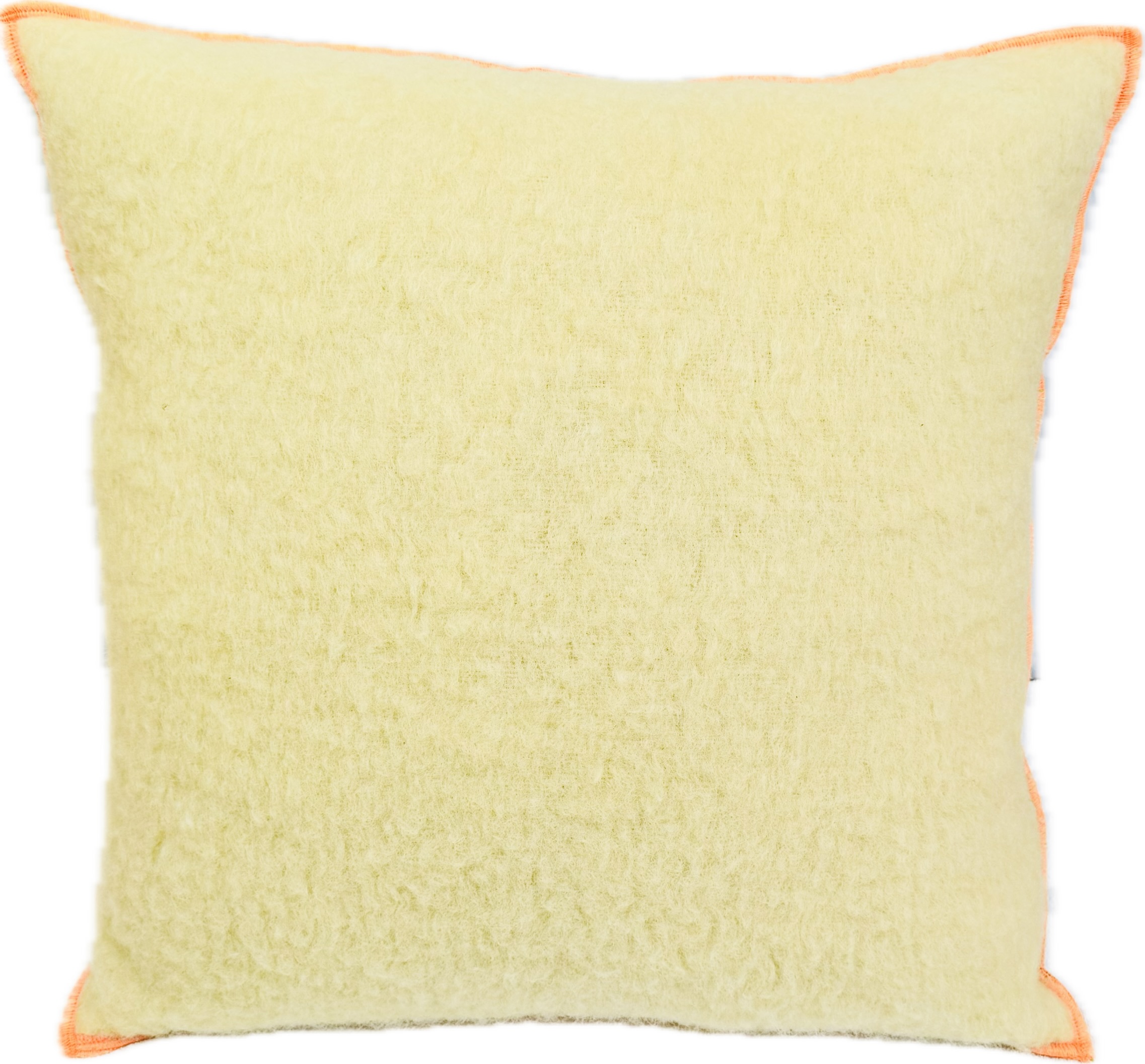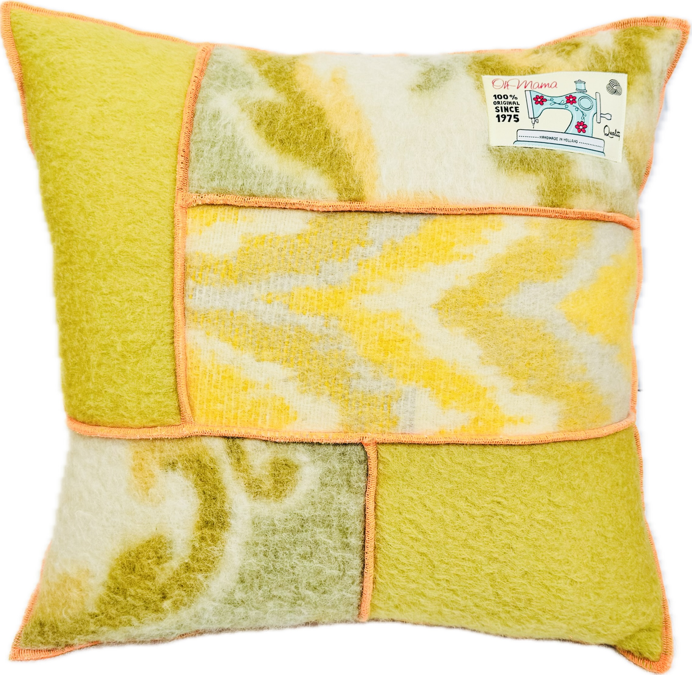 Dit handgemaakt wollen kussen 45×45 cm gerecyclede wol is met liefde gemaakt uit zorgvuldig geselecteerde vintage dekens en afgewerkt met neon oranje lockgaren. Je haalt daarmee een uniek, duurzaam designstuk in huis: de zachtheid van wol, het verhaal van hergebruik en een moderne, speelse touch.